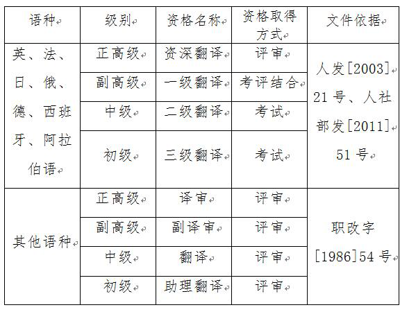 根據《翻譯專業資格(水平)考試暫行規定》和《資深翻譯和一級翻譯專業資格(水平)評價辦法(試行)》,各省、自治區、直轄市和國務院有關部門、中央管理的企業不再進行翻譯係列英、法、日、俄、德、西班牙、阿拉伯等7個語種助理翻譯、翻譯、副譯審、譯審任職資格的評審。