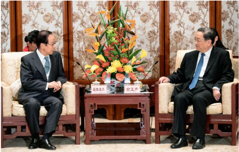 2015年,俞正聲同誌會見來華參加由中國外文局和日本言論NPO共同主辦的“北京—東京論壇”的日本前首相福田康夫一行