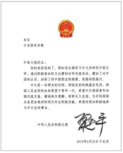 2019年6月,中國國家主席習近平給在“熊貓杯”日本青年征文大賽中獲獎的日本青年中島大地回信,寄望中日兩國青年為開創兩國關係美好明天作出積極貢獻。“熊貓杯”全日本青年征文大賽創辦於2014年,由中國外文局人民中國雜誌社、中國駐日本大使館和日本科學協會共同主辦,旨在讓日本青年更加全麵、客觀、理性地了解中國。