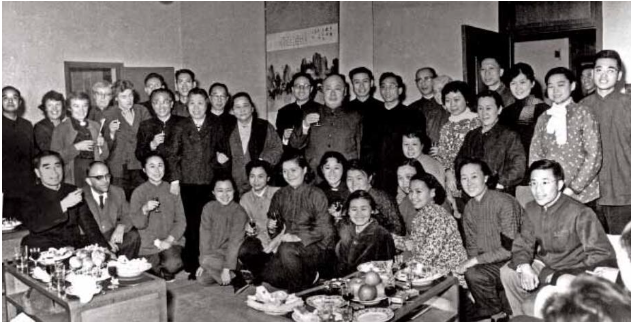 1962年,《中國建設》創刊10周年。周恩來(前排左一)、宋慶齡(後排左十一)、陳毅(後排左十三)、鄧穎超(後排左九)與雜誌社工作人員聯歡時留影