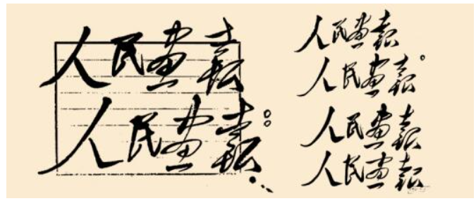 1950年,毛澤東主席為新創刊的《人民畫報》題寫的刊名手跡。當時,他分別在兩張紙上題寫了六條,並在他最滿意的一條右上方畫了兩個圈,這便是被一直沿用至今的《人民畫報》刊名