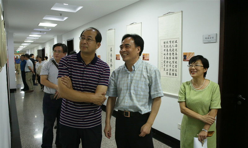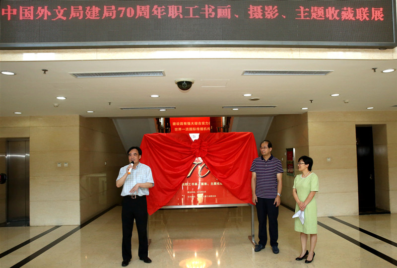 今年是新中國成立70周年,也是中國外文局建局70周年。值此建局70周年之際,為展現中國外文局廣大幹部職工立足本職,昂揚向上的精神風貌,抒發對偉大祖國和外宣事業的熱愛之情。外文局局工會聯合會舉辦了以“不忘初心、牢記使命”為主題的建局70周年職工書畫、攝影、主題收藏聯展。9月3日上午,展覽在局主樓一樓大廳隆重開幕。副局長、局直屬機關黨委書記陸彩榮在開幕式上致辭;中央和國家機關工委群眾工作部(統戰部)部長、中央和國家機關工會聯合會常務副主席馬勇明特邀出席開幕式並為展覽揭幕。外文局局屬各單位、機關各部室相關領導及參展作品作者近50人參加了開幕式。開幕式由外文局直屬機關黨委常務副書記、紀委書記,局工會聯合會主席楊英姿主持。