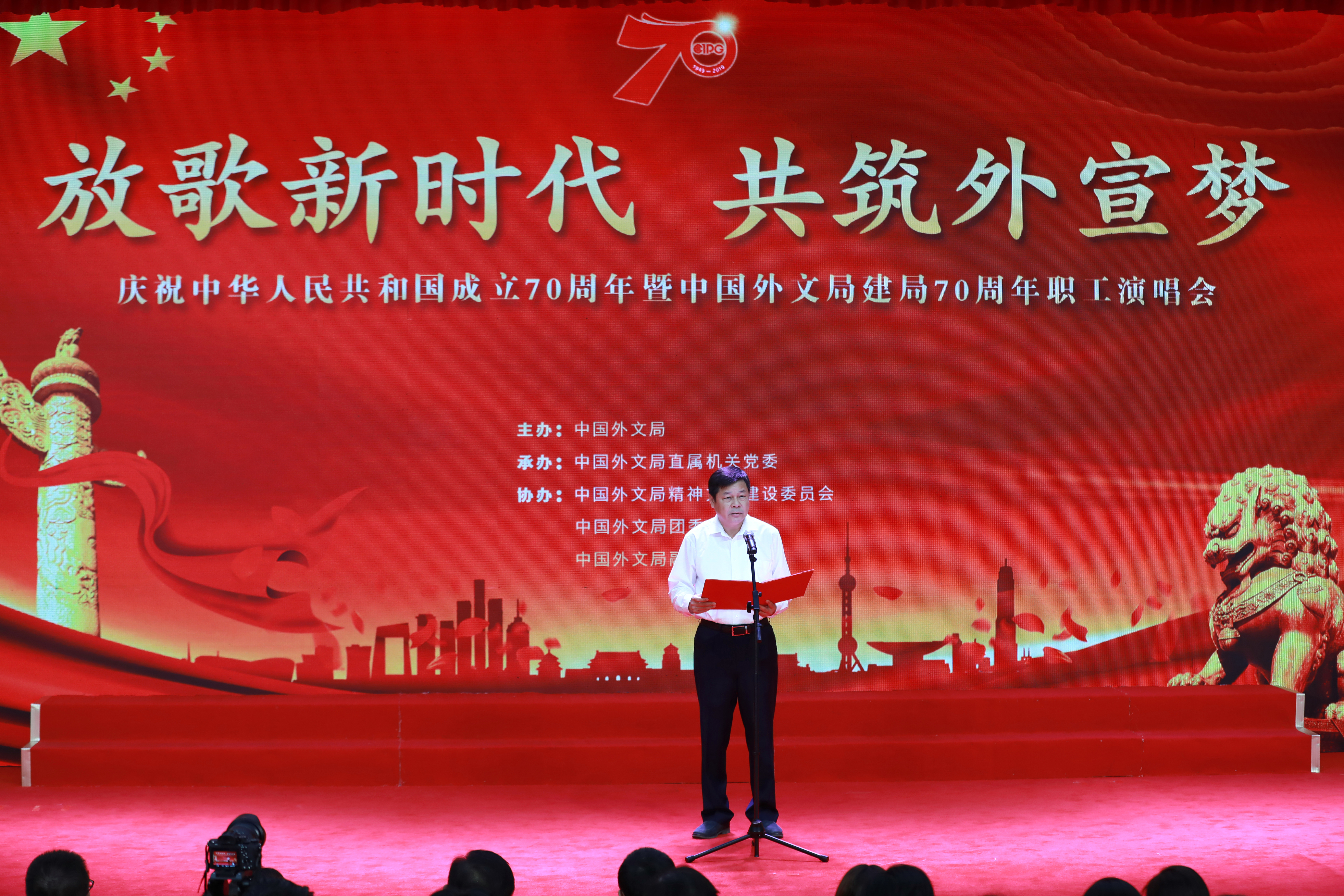 9月25日,中國外文局舉辦“放歌新時代 共築外宣夢”慶祝中華人民共和國成立70周年暨中國外文局建局70周年職工演唱會。局長杜占元出席並致辭,副局長陸彩榮、高岸明、劉大為,局副總編輯陳實出席。