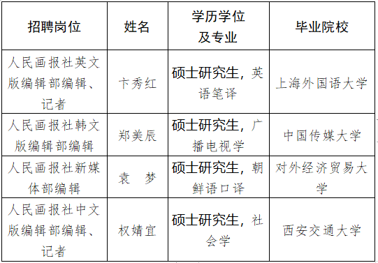 根據事業單位公開招聘工作有關規定和《中國外文局所屬企事業單位2020年度公開招聘工作人員簡章》,現將中國外文局所屬人民畫報社2020年度擬聘用事業單位工作人員予以公示。公示期間,如有問題,請向中國外文局反映。