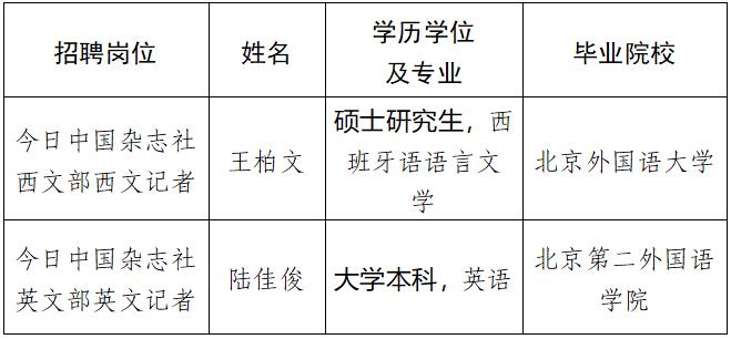 根據事業單位公開招聘工作有關規定和《中國外文出版發行事業局所屬企事業單位2020年度公開招聘工作人員簡章》,現將中國外文局所屬今日中國雜誌社2020年度擬聘用事業單位工作人員予以公示。公示期間,如有問題,請向中國外文局所反映。