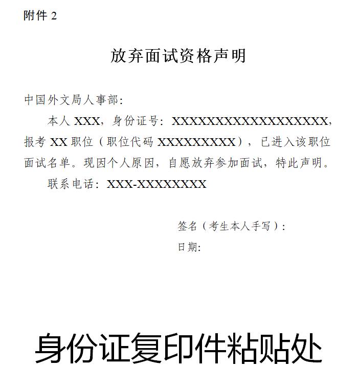 放棄麵試的考生請填寫《放棄公務員麵試的聲明》(詳見附件2),經本人簽名,於8月14日17時前傳真至或發送掃描件至shwyuan@cipg.org.cn。未在規定時間內填報放棄聲明,又因個人原因不參加麵試的,視情節將上報中央公務員主管部門記入誠信檔案。
