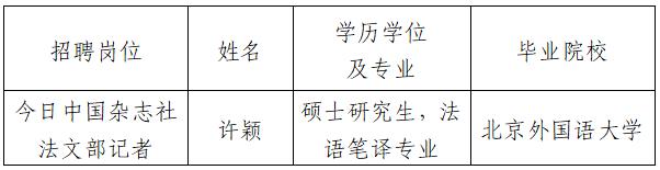 根據事業單位公開招聘工作有關規定和《中國外文出版發行事業局所屬企事業單位2020年度公開招聘工作人員簡章》,現將中國外文局所屬今日中國雜誌社2020年度擬聘用事業單位工作人員予以公示。公示期間,如有問題,請向中國外文局反映。