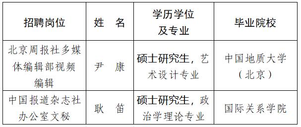 根據事業單位公開招聘工作有關規定和《中國外文出版發行事業局所屬企事業單位2020年度公開招聘工作人員簡章》,現將中國外文局所屬北京周報社、中國報道雜誌社2020年度擬聘用事業單位工作人員予以公示。公示期間,如有問題,請向中國外文局反映。