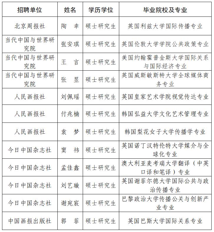 根據有關規定和《中國外文出版發行事業局所屬企事業單位2020年海外留學生招聘簡章》,現將中國外文局北京周報社、當代中國與世界研究院、人民畫報社、今日中國雜誌社、中國畫報出版社2020年度擬接收海外留學生予以公示。公示期間,如有問題,請向中國外文局反映。
