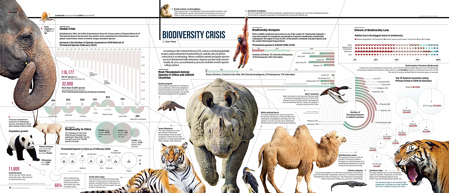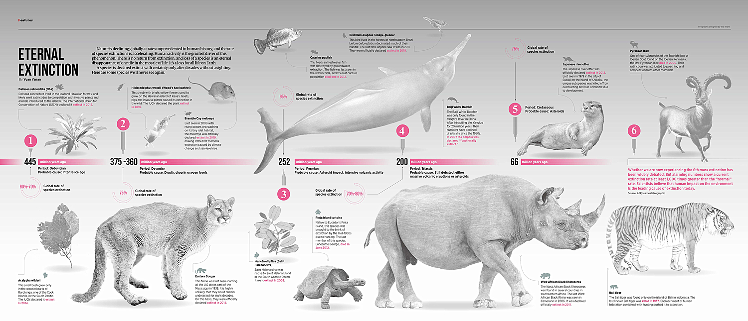 本(ben)組(zu)圖(tu)表(biao)由(you)中(zhong)國(guo)外(wai)文(wen)局(ju)所(suo)屬(shu)中(zhong)國(guo)報(bao)道(dao)雜(za)誌(zhi)社(she)製(zhi)作(zuo),巧(qiao)妙(miao)地(di)通(tong)過(guo)色(se)彩(cai)將(jiang)現(xian)存(cun)生(sheng)物(wu)與(yu)滅(mie)絕(jue)生(sheng)物(wu)進(jin)行(xing)區(qu)分(fen),形(xing)成(cheng)了(le)強(qiang)烈(lie)的(de)視(shi)覺(jiao)衝(chong)擊(ji)力(li)和(he)良(liang)好(hao)的(de)信(xin)息(xi)傳(chuan)達(da)的(de)層(ceng)次(ci)感(gan)。