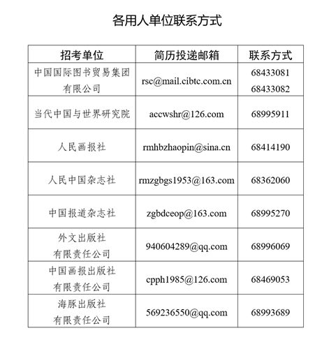 中國國際圖書貿易集團有限公司、當代中國與世界研究院、人民畫報社、人民中國雜誌社、中國報道雜誌社、外文出版社有限責任公司、中國畫報出版社有限責任公司、海豚出版社有限責任公司等8家企事業單位共計劃招聘13名海外留學生。用人單位招聘崗位及具體條件詳見“中國外文出版發行事業局所屬企事業單位2021年海外留學生招聘崗位一覽表”。