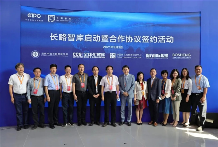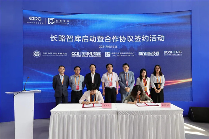 9月3日,長略智庫啟動暨當代中國與世界研究院與全球化智庫全麵戰略合作協議簽約活動在2021中國國際服務貿易交易會會場舉行。中國外文局副局長陸彩榮,國務院參事、全球化智庫理事長王輝耀等出席活動並見證簽約。當代中國與世界研究院、全球化智庫負責人進行了在現場簽約,局屬相關單位、局計劃財務部主要負責人參加。