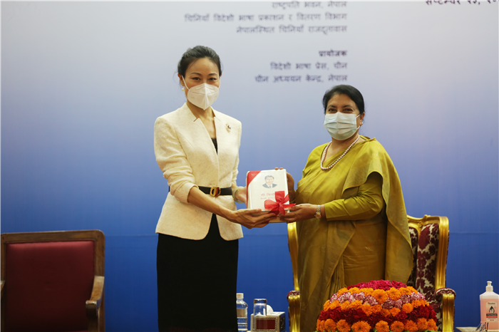 侯豔琪代表中方向班達裏總統贈送《習近平談治國理政》第二卷尼泊爾文版和第三卷英文版