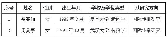 經個人申請、局博士後管理辦公室審核、局博士後指導專家組會審、麵試、實踐考察、體檢,現將中國外文局2021年擬招收博士後人員予以公示,公示結束無異議後,報全國博士後管理委員會審批辦理進站。