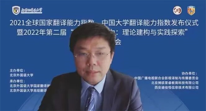 5月28日,2021全球國家翻譯能力指數、中國大學翻譯能力指數發布儀式暨2022年第二屆“國家翻譯能力:理論建構與實踐探索”學術研討會在線上召開。中國外文局副局長兼總編輯、中國翻譯協會常務副會長兼秘書長高岸明,北京外國語大學副校長趙剛出席會議並致辭。