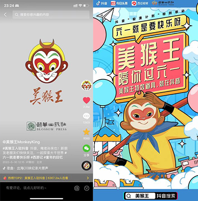 5月30日,朝華出版社“美猴王”賬號入駐抖音平台,引起廣大網友熱烈關注,24小時內“美猴王”首條視頻穩居抖音熱榜前列,話題熱度高達6000多萬,視頻播放量達200多萬。目前粉絲8.3萬,獲點讚6.8萬,有10多家公司私信洽商合作。抖音平台在兒童節當天以開屏廣告形式為賬號推流。