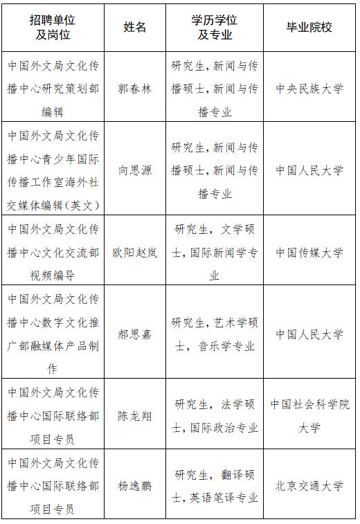 根據事業單位公開招聘工作有關規定和《中國外文出版發行事業局所屬企事業單位2022年度公開招聘工作人員公告》,現將中國外文局所屬中國外文局文化傳播中心2022年度擬聘用事業單位工作人員予以公示。公示期間,如有問題,請向中國外文局反映。