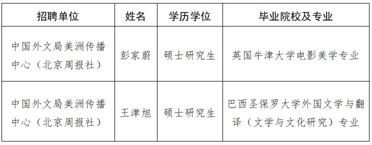 根據有關規定和《中國外文局所屬企事業單位2022年海外留學生招聘公告》,現將中國外文局美洲傳播中心(北京周報社)2022年度擬接收海外留學生予以公示。公示期間,如有問題,請向中國外文局反映。