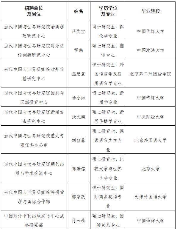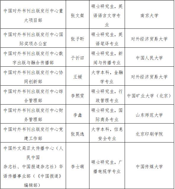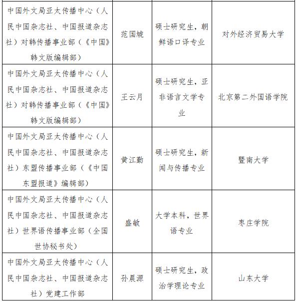 根據事業單位公開招聘工作有關規定和《中國外文局所屬企事業單位2022年度公開招聘工作人員公告》,現將中國外文局所屬當代中國與世界研究院、中國對外書刊出版發行中心、中國外文局亞太傳播中心(人民中國雜誌社、中國報道雜誌社)2022年度擬聘用事業單位工作人員予以公示。公示期間,如有問題,請向中國外文局反映。