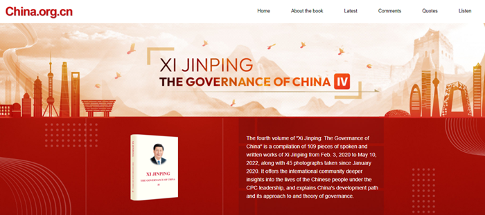 7月22日,中國網宣介闡釋《習近平談治國理政》第四卷英文專題正式上線。該專題以紅色為主色調,設置“最新動態(Latest)”“解讀(Comments)”“金句(Quotes)”“誦讀(Listen)”“延伸閱讀(Other Volumes)”等欄目,立體呈現《習近平談治國理政》第四卷重點內容,展現中國故事及其背後的思想力量和精神力量。專題上線3天,全渠道瀏覽量超50萬。