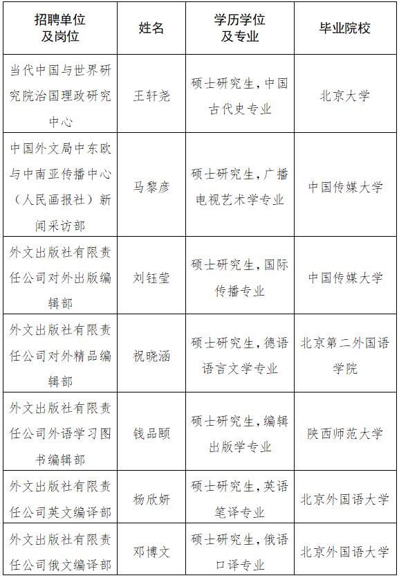 根據企事業單位公開招聘工作有關規定和《中國外文出版發行事業局所屬企事業單位2022年度公開招聘工作人員公告》,現將中國外文局所屬當代中國與世界研究院、中國外文局中東歐與中南亞傳播中心(人民畫報社)、外文出版社有限責任公司、中國外文局翻譯院2022年度擬聘用工作人員予以公示。公示期間,如有問題,請向中國外文局反映。