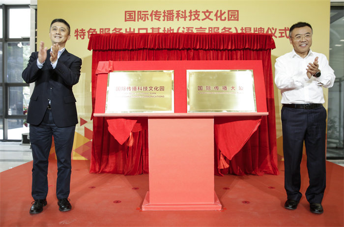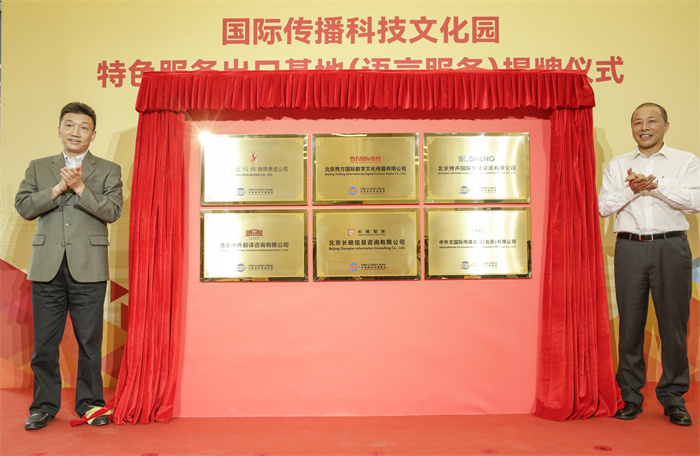 中國外文局局長杜占元,副局長陸彩榮、高岸明、劉大為、於濤及國圖集團主要負責同誌,分別為國際傳播科技文化園特色服務出口基地(語言服務)、國際傳播科技文化園、國際傳播大廈、首批入駐國際傳播大廈的6家外文局局屬企業揭牌。首批入駐國際傳播大廈的6家外文局局屬企業是:海豚出版社有限責任公司、北京煦方國際數字文化傳媒有限公司、北京博聲國際文化交流有限公司、北京中外翻譯谘詢有限公司、北京長略信息谘詢有限公司和中外文國際傳播發展(北京)有限公司。