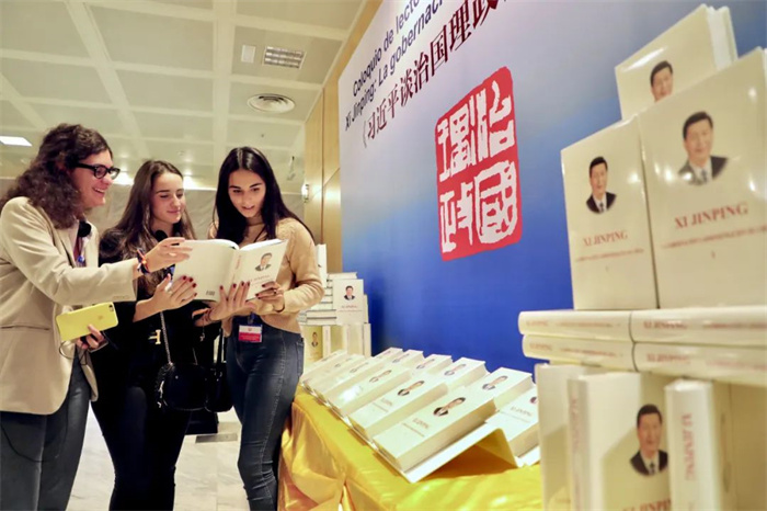 2018年11月,西班牙讀者在《習近平談治國理政》中西讀者會上閱讀西文版圖書