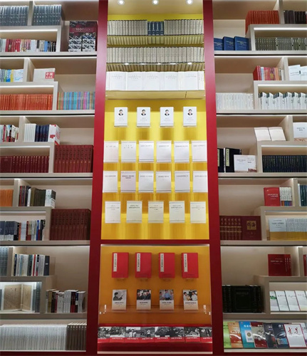 在中央綜合展區入口處,一麵書牆展示了十年來黨的創新理論重要著作及重點出版物,中國外文局外文出版社出版的《習近平談治國理政》第一至四卷多語種版以及線裝版等總書記著作擺在最顯著的位置。此外,外文出版社出版的《學術中國·中國電影史》《中國工農紅軍長征簡史》英文版,新世界出版社出版的“中國關鍵詞”係列多語種圖書,海豚出版社出版的“許淵衝譯莎士比亞”係列叢書等也都在書牆上展示陳列。