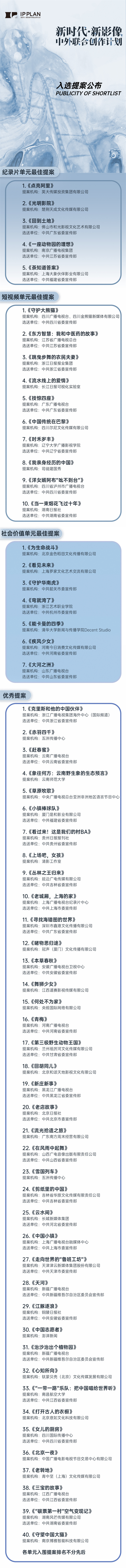 據了解,各省區市黨委宣傳部、中央宣傳文化單位、大專院校、國內外影視機構等200餘家單位作為參評單位組織了提案申報工作。創作計劃近期將舉辦“創作工作坊”,邀請國內外知名導演和業內專家對入選提案製作團隊開展係統培訓。全部入選提案製作完成後,將於明年舉辦成果展映活動。