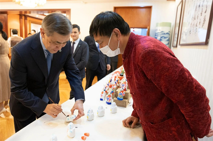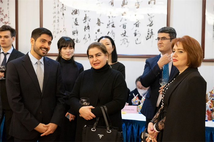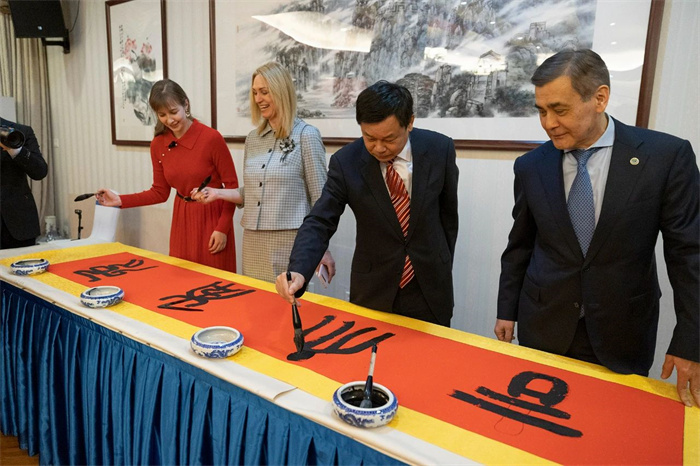 招待會上,駐華使節共同欣賞傳統藝術表演,體驗北京泥彩塑、膠州剪紙等非遺技藝,並共寫書法長卷,感受中國傳統春節習俗。與會嘉賓互道節日祝福,暢談未來合作與發展願望,現場掌聲、音樂聲、歡笑聲此起彼伏,充滿了喜樂祥和的節日氣氛。