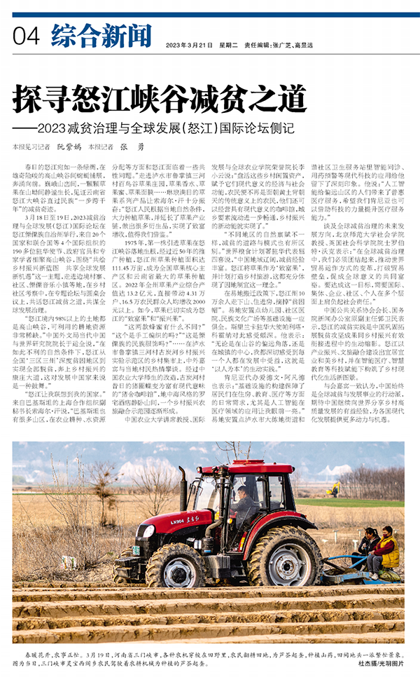 3月18日至19日,2023減貧治理與全球發展(怒江)國際論壇在怒江傈僳族自治州舉行,來自20個國家和聯合國等4個國際組織的190多位駐華使節、政府官員和專家學者相聚高山峽穀,圍繞“共繪鄉村振興新藍圖 共享全球發展新機遇”這一主題,走進邊境村寨、社區、傈僳音樂小鎮等地,在鄉村社區考察中,在專題論壇與圓桌會議上,共話怒江減貧之道,共謀全球發展治理。