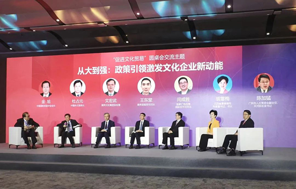 杜占元提出四點建議:第一,樹立文化自信,建設和傳播中華民族現代文明,是當前對外文化貿易和文化強國建設的根本出發點;第二,圍繞中華民族現代文明打造國際傳播品牌,推動中國文化產品進入世界知識體係;第三,支持和鼓勵文化業態創新;第四,增強語言服務和話語體係支持。