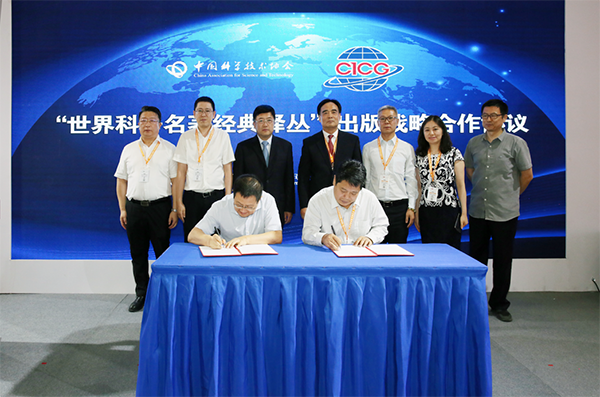 6月15日,中國科學技術出版社有限公司與華語教學出版社在中國外文局展台簽訂“世界科普名著經典譯叢”出版戰略合作協議。中國科學技術協會書記處書記王進展、中國外文局副局長陸彩榮出席儀式並致辭。