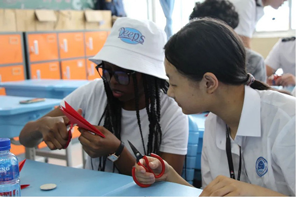 在非遺文化課堂上,外籍青年們體驗了曆史悠久的剪紙藝術。剪紙老師以獨具文化特色的“百變團花”為例,讓外籍青年們初步感受了窗花剪紙的藝術——從紙的折疊到剪刀的運用,逐一講解、示範,大家聽得專注,學得認真,收獲了一幅屬於自己的充滿膠東地域文化特色的剪紙作品。