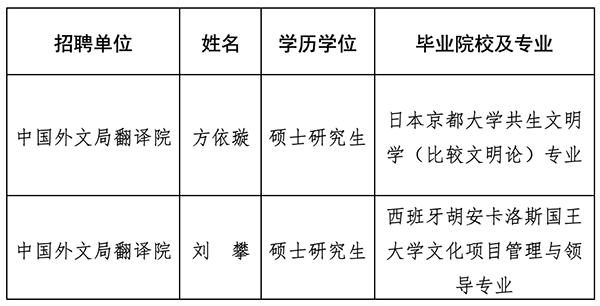 根據有關規定和《中國外文出版發行事業局所屬企事業單位2023年海外留學生招聘公告》,現將中國外文出版發行事業局所屬中國外文局翻譯院2023年度擬接收海外留學生予以公示。公示期間,如有問題,請向中國外文局人事部反映。