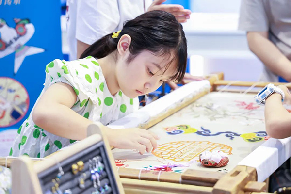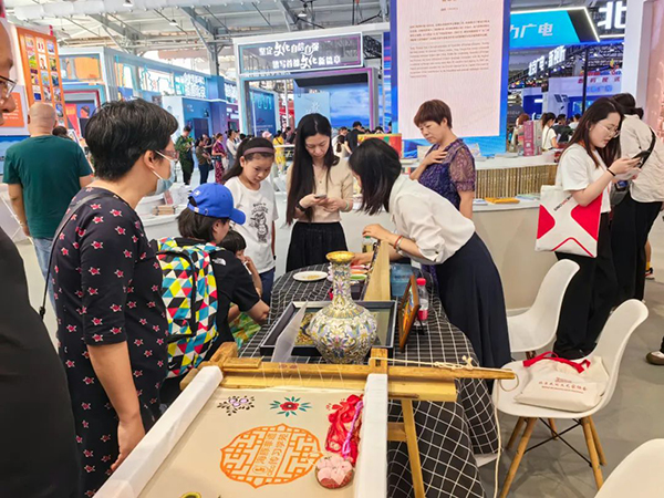 海豚出版社舉辦海豚非遺傳習學苑非遺互動活動,其文創展示銷售區吸引了大量觀眾前來互動選購
