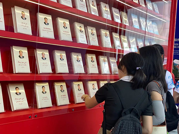 本屆展會共展出《習近平談治國理政》第一至四卷及《擺脫貧困》《之江新語》等總書記著作百餘本,吸引各界觀眾關注。開館以來,包括出席第十一次全國歸僑僑眷代表大會的代表、各地市政府企業參訪團組等多個團組及國內外觀眾到中國外文局展台參觀並在著作展示區前合影留念。