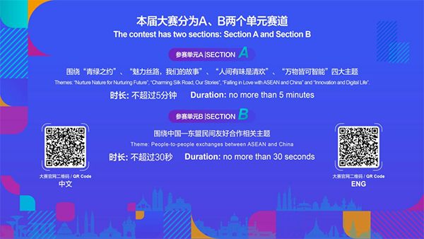 本屆大賽主題為“心心相連 築夢未來”,分為兩個參賽單元,征集主題包括“青綠之約”“魅力絲路,我們的故事”“人間有味是清歡”“萬物皆可智能”以及中國—東盟民間友好合作等相關主題,旨在通過多形式、多語種的短視頻作品,促進中國與東盟各國之間的人文交流,助力中國—東盟合作進一步深化。