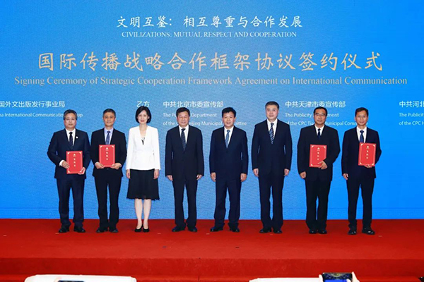 論壇期間,中國外文局與中共北京市委宣傳部、中共天津市委宣傳部、中(zhong)共(gong)河(he)北(bei)省(sheng)委(wei)宣(xuan)傳(chuan)部(bu)舉(ju)行(xing)國(guo)際(ji)傳(chuan)播(bo)戰(zhan)略(lve)合(he)作(zuo)框(kuang)架(jia)協(xie)議(yi)的(de)簽(qian)約(yue)儀(yi)式(shi),旨(zhi)在(zai)充(chong)分(fen)發(fa)揮(hui)各(ge)自(zi)優(you)勢(shi),加(jia)強(qiang)國(guo)際(ji)傳(chuan)播(bo)協(xie)同(tong)協(xie)作(zuo),提(ti)升(sheng)國(guo)際(ji)傳(chuan)播(bo)效(xiao)能(neng),共(gong)同(tong)對(dui)外(wai)講(jiang)好(hao)中(zhong)國(guo)故(gu)事(shi)、傳播好中國聲音。