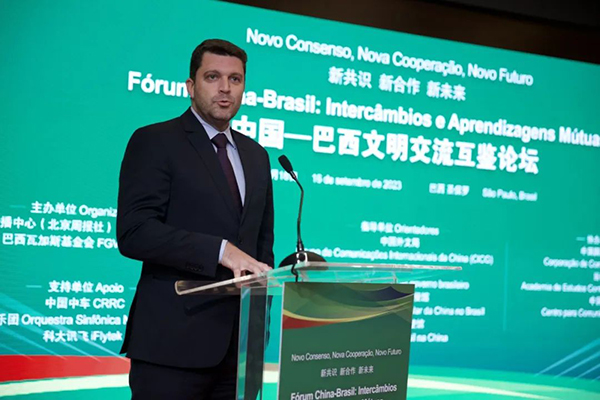 當地時間9月16日,第二屆中國—巴西文明交流互鑒論壇在巴西聖保羅舉行。論壇主題為“新共識、新合作、新未來”。中國外文局副局長劉大為、巴西文化部國際事務特別顧問總協調員維尼修斯·古特勒·羅薩出席論壇並致辭,中國政府拉美事務特別代表邱小琪、中國駐巴西大使祝青橋、巴西駐華大使高望發表視頻致辭。中國中車董事長孫永才、中國美術館館長吳為山、巴西瓦加斯基金會法學院國際交流部主任羅德裏戈·維安那作大會發言。中國駐聖保羅副總領事田玉震等中巴政府、智庫、媒體、青年代表約100人出席活動。