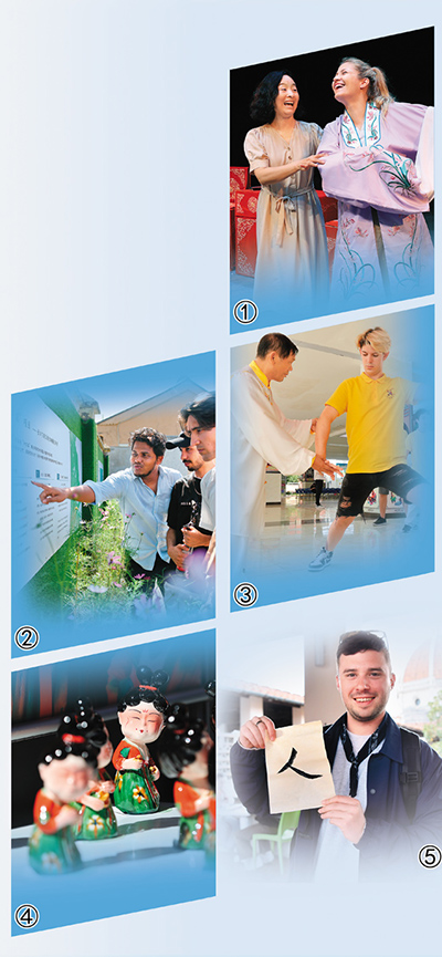 圖①:9月9日,在山東省東營市呂劇團的舞台上,國際友人在呂劇藝術表演者的指導下,“沉浸式”體驗國家級非物質文化遺產呂劇的魅力。周廣學攝(人民視覺)