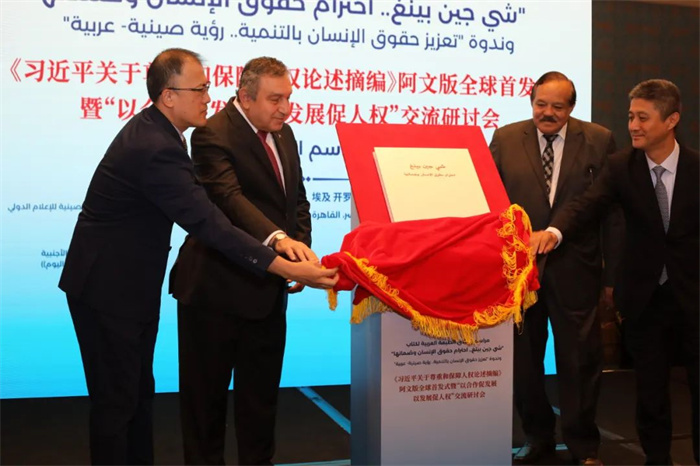 中國外文局副局長兼總編輯高岸明、埃及前總理伊薩姆·沙拉夫、中國駐埃及大使館臨時代辦張濤、阿拉伯國家聯盟秘書處人權司司長穆尼爾·法西出席首發式並致辭。