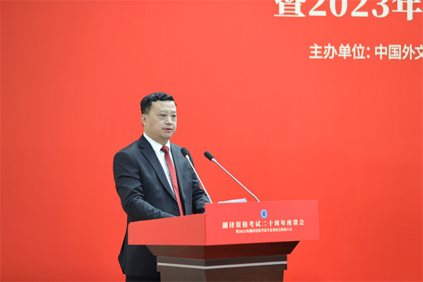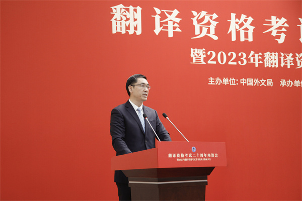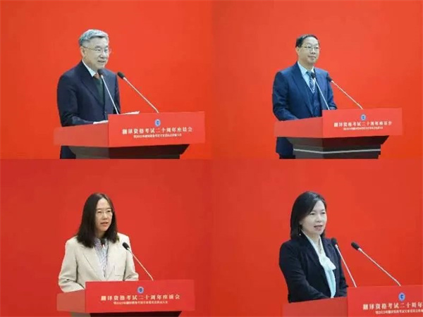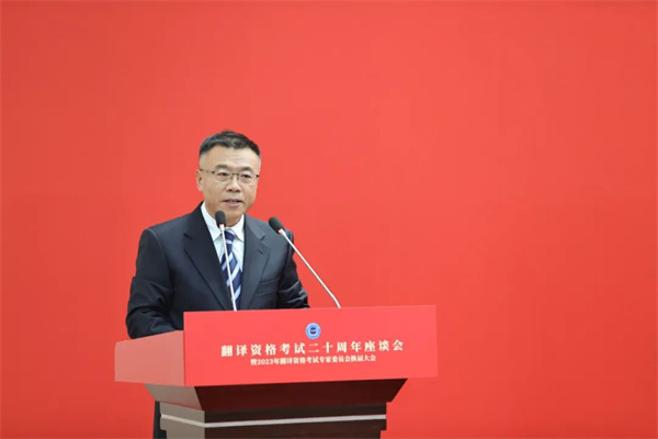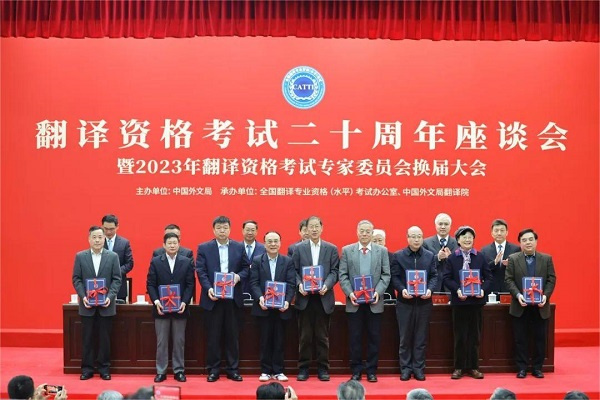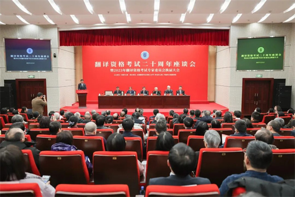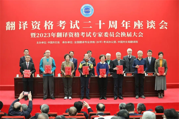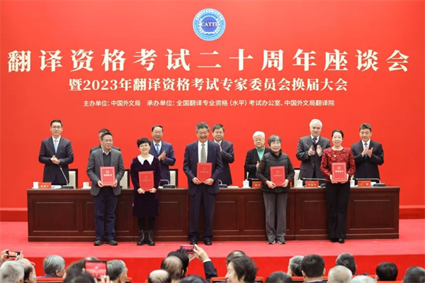 12月15日,全國翻譯專業資格(水平)考試二十周年座談會暨2023年翻譯資格考試專家委員會換屆大會在京召開。中國外文局局長、中國翻譯協會會長杜占元,中國外文局副局長、翻譯資格考試領導小組組長劉大為,中國外文局副局長、翻譯資格考試領導小組副組長於濤,人力資源社會保障部專業技術人員管理司司長李金生出席會議。