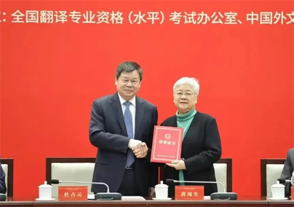 杜占元為翻譯資格考試顧問唐聞生頒發榮譽證書