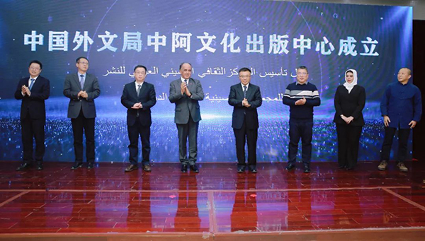 劉大為、阿迪勒·阿拉比、王廣大、納斯拉·哈吉裏及中國外文局中阿文化出版中心部分成員單位負責人共同為中阿文化出版中心成立揭幕。