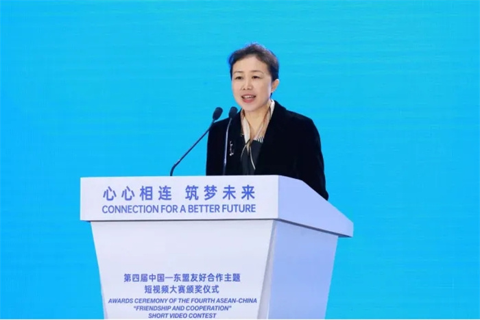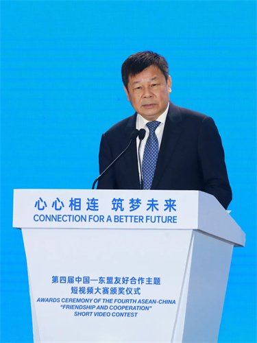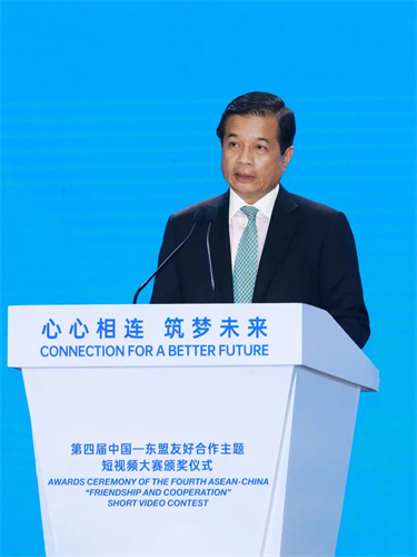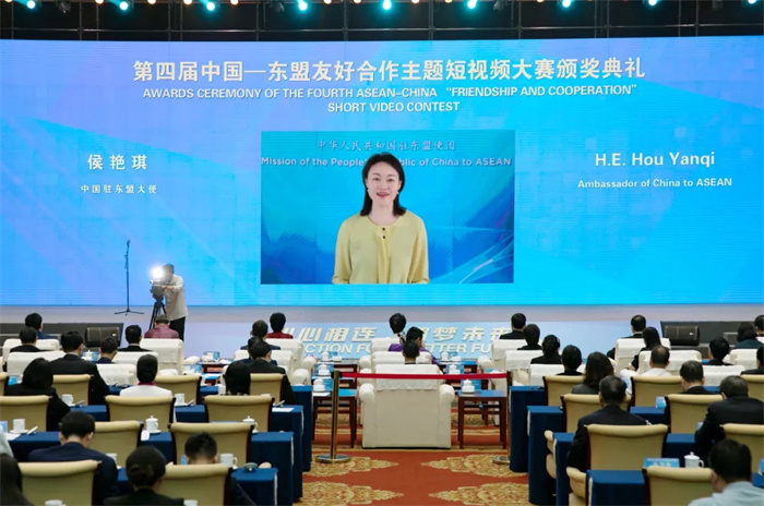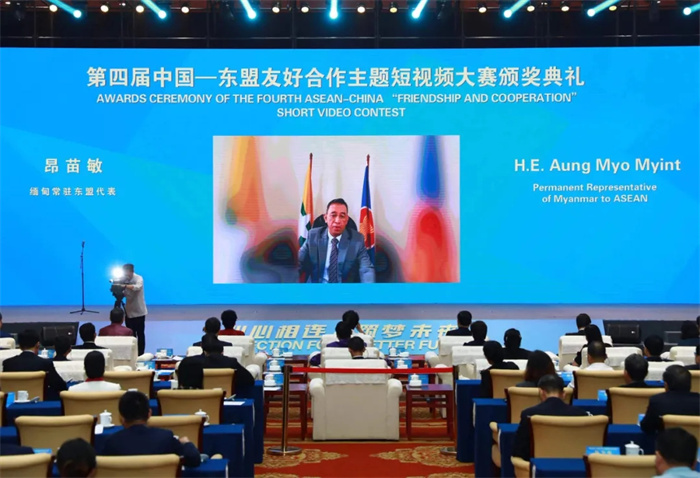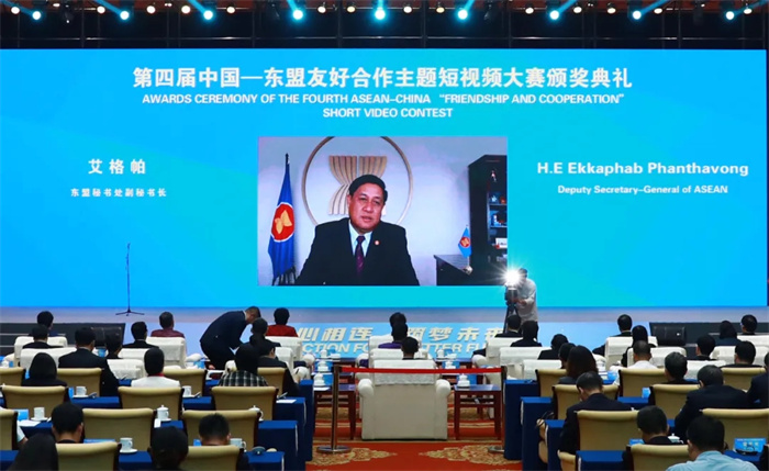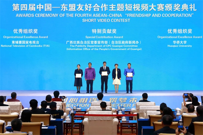3月26日,第四屆中國—東盟友好合作主題短視頻大賽頒獎典禮在廣西南寧舉辦。中國經濟社會理事會常務理事、廣西壯族自治區政協原主席陳際瓦,中國外文局局長杜占元,廣西壯族自治區黨委常委、宣(xuan)傳(chuan)部(bu)部(bu)長(chang)陳(chen)奕(yi)君(jun),廣(guang)西(xi)壯(zhuang)族(zu)自(zi)治(zhi)區(qu)人(ren)民(min)政(zheng)府(fu)副(fu)主(zhu)席(xi)苗(miao)慶(qing)旺(wang),中(zhong)國(guo)駐(zhu)東(dong)盟(meng)大(da)使(shi)侯(hou)豔(yan)琪(qi),外(wai)交(jiao)部(bu)亞(ya)洲(zhou)司(si)參(can)讚(zan)魏(wei)欣(xin),國(guo)家(jia)廣(guang)播(bo)電(dian)視(shi)總(zong)局(ju)國(guo)際(ji)合(he)作(zuo)司(si)副(fu)司(si)長(chang)燕(yan)旎(ni),老(lao)撾(wo)駐(zhu)華(hua)大(da)使(shi)宋(song)蓬(peng),柬(jian)埔(pu)寨(zhai)新(xin)聞(wen)部(bu)國(guo)務(wu)秘(mi)書(shu)霍(huo)恩(en)慶(qing)威(wei),東(dong)盟(meng)副(fu)秘(mi)書(shu)長(chang)艾(ai)格(ge)帕(pa),緬(mian)甸(dian)常(chang)駐(zhu)東(dong)盟(meng)代(dai)表(biao)昂(ang)苗(miao)敏(min),柬(jian)埔(pu)寨(zhai)新(xin)聞(wen)部(bu)部(bu)長(chang)辦(ban)公(gong)廳(ting)副(fu)主(zhu)任(ren)兼(jian)新(xin)聞(wen)部(bu)顧(gu)問(wen)唐(tang)坤(kun)宇(yu)梁(liang)等(deng)主(zhu)要(yao)嘉(jia)賓(bin)出(chu)席(xi)活(huo)動(dong)。中(zhong)國(guo)外(wai)文(wen)局(ju)副(fu)局(ju)長(chang)陸(lu)彩(cai)榮(rong)主(zhu)持(chi)頒(ban)獎(jiang)典(dian)禮(li)致(zhi)辭(ci)環(huan)節(jie)。