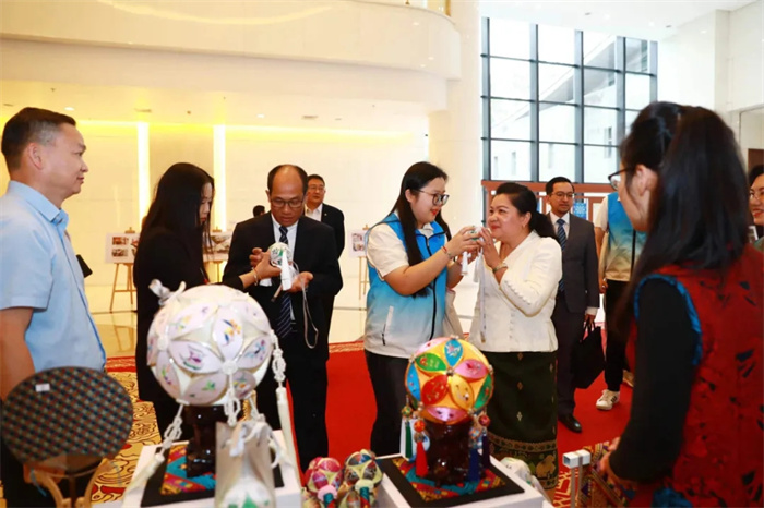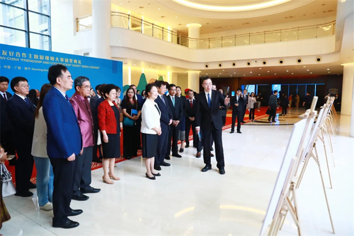 活動前,與會領導嘉賓參觀第四屆中國—東盟友好合作主題短視頻大賽優秀作品圖片展及非遺展