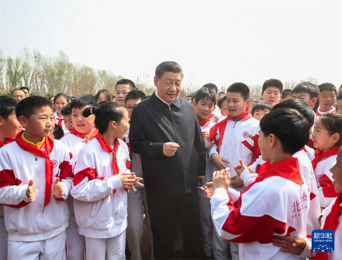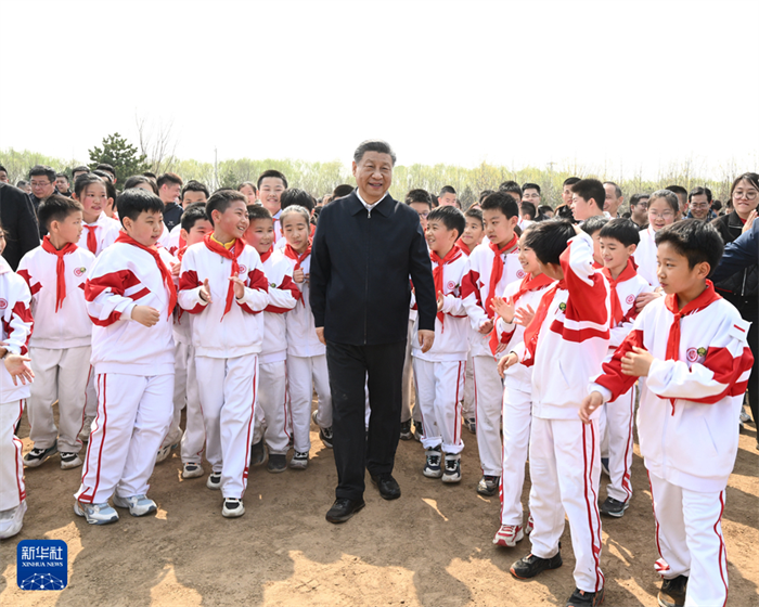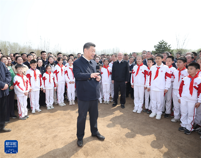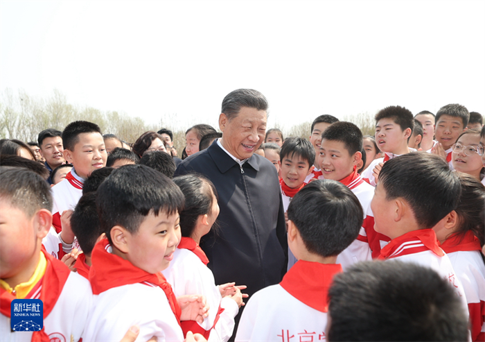 4月3日,黨和國家領導人習近平、李強、趙樂際、王滬寧、蔡奇、丁薛祥、李希、韓正等來到北京市通州區潞城鎮參加首都義務植樹活動。這是習近平同少先隊員在一起。新華社記者李學仁攝