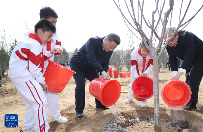 4月3日,黨和國家領導人習近平、李強、趙樂際、王滬寧、蔡奇、丁薛祥、李希、韓正等來到北京市通州區潞城鎮參加首都義務植樹活動。這是習近平同少先隊員一起給剛栽下的樹苗澆水。新華社記者鞠鵬攝