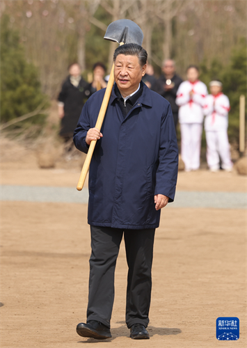 4月3日,黨和國家領導人習近平、李強、趙樂際、王滬寧、蔡奇、丁薛祥、李希、韓正等來到北京市通州區潞城鎮參加首都義務植樹活動。這是習近平扛起鐵鍬走向植樹地點。新華社記者龐興雷攝